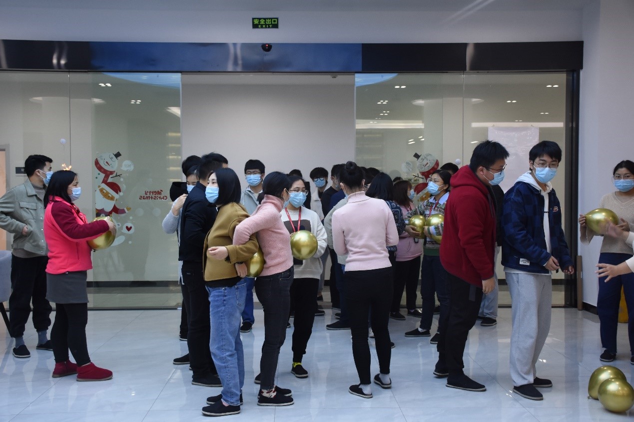12月24日12:45活動正式開始,前來參與部門活動的同事們熱情高漲,早早地等在了悅動芯球門口。活動伊始,銷售管理部的同事一馬當(dāng)先,兩人夾著氣球飛快的沖向終點(diǎn),最先將三個(gè)氣球運(yùn)輸過線。經(jīng)過一番激烈的比拼,每個(gè)部門都拿到了一份用來裝飾辦公室的禮品。當(dāng)日下午,圣誕老人帶著圣誕賀卡與任務(wù)卡從悅動芯球出發(fā),敲響每一個(gè)辦公室的大門,一聲“Merry Christmas”,為每位同事送去圣誕的祝福。辦公室里手快的同事們已經(jīng)用中午贏得的小禮品裝飾起了辦公室,同事們見到圣誕老人都很興奮,紛紛要求合影留念,臉上洋溢著快樂的笑容。