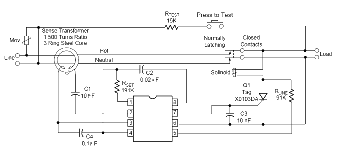 外部感測變壓器,SCR,繼電器,兩個電阻器和三個電容器完成了電路中斷器的設(shè)計。 簡單的布局和最少的元件數(shù)量確保易用性和長期可靠性。